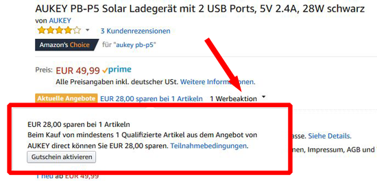 Ein solches, noch dazu äußerst empfehlenswertes, erhält man derzeit drastisch vergünstigt bei Amazon. Es handelt sich dabei um das faltbare AUKEY PB-P5 Solar Ladegerät mit 2 USB Ports, welches man dank einer Gutschein-Aktion aktuell mit einem Rabatt von € 28,- ergattern kann und somit statt € 49,99 lediglich € 21,99 zahlt. Hierzu muss lediglich der unterhalb des Preises angezeigte Gutschein per Mausklick aktiviert werden (siehe nachfolgender Screenshot), der Preis wird dann automatisch an der Amazon-Kasse abgezogen. Der folgende Link führt direkt zum Angebot: AUKEY PB-P5 Solar Ladegerät mit 2 USB Ports