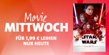 Auch heute hat Apple wieder den sogenannten "Movie Mittwoch" ausgerufen. Dabei wird jeden Mittwoch ein ausgewählter Film aus dem iTunes-Sortiment für 24 Stunden zum Sonderpreis von nur € 1,99 in HD-Qualität zum Leihen angeboten. Heute erhält man dabei den den neuesten Teil der Star-Wars-Saga Star Wars: Die letzten Jedi (Episode VIII). Nachdem man den Leih-Film geladen hat, kann er innerhalb von 30 Tagen angeschauen werden. Wie immer bei geliehenen Filmen aus dem iTunes Store gilt: Hat man hiermit einmal begonnen, muss man ihn innerhalb von 48 Stunden beenden.