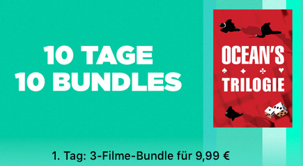 Apple hat im iTunes Store eine neue Aktion namens "10 Tage, 10 Bundles" gestartet, bei der sich an den kommenden 10 Tagen jeweils ein ausgewähltes Film-Bundle vergünstigt aus dem iTunes Sote laden lassen wird. Den Anfang macht dabei heute die "Ocean's Trilogie" in HD-Qualität, bestehend aus den bisherigen drei Teilen der Gaunerkomödie um Danny Ocean a.k.a. George Clooney. Würde man sich die drei Filme einzeln im iTunes Store kaufen, müsste man für jeden einzelnen € 9,99 hinblättern. Dank der Aktion bekommt man nun alle drei Filme im Bundle für zusammen nur € 9,99. Wie immer gilt bei Kauf-Filmen aus dem iTunes Store, dass diese so oft geschaut werden können, wie man mag und dass man sie jederzeit erneut aus dem iTunes Store herunterladen kann. Hier gehts zum heute vergünstigten Bundle: Ocean's Trilogie
