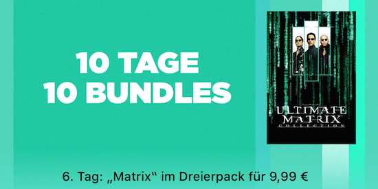 Auch heute läuft wieder Apples Aktion "10 Tage, 10 Bundles", bei der sich an 10 Tagen im Juli jeweils ein ausgewähltes Film-Bundle vergünstigt aus dem iTunes Sore laden lassen wird. Dabei lässt sich heute die "Matrix Trilogie" in HD-Qualität vergünstigt erwerben. Würde man sich die Filme einzeln im iTunes Store kaufen, müsste man insgesamt € 29,97 hinblättern. Dank der Aktion bekommt man nun alle drei im Bundle für zusammen nur € 9,99. Wie immer gilt bei Kauf-Filmen aus dem iTunes Store, dass diese so oft geschaut werden können, wie man mag und dass man sie jederzeit erneut aus dem iTunes Store herunterladen kann. Hier gehts zum heute vergünstigten Bundle: Matrix Trilogie