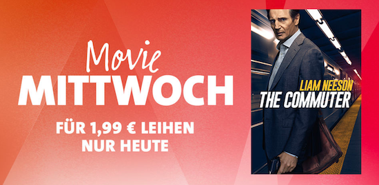 Auch heute hat Apple wieder den sogenannten "Movie Mittwoch" ausgerufen. Dabei wird jeden Mittwoch ein ausgewählter Film aus dem iTunes-Sortiment für 24 Stunden zum Sonderpreis von nur € 1,99 in HD-Qualität zum Leihen angeboten. Heute erhält man dabei den den Action-Kracher The Commuter mit Liam Neeson. Nachdem man den Leih-Film geladen hat, kann er innerhalb von 30 Tagen angeschauen werden. Wie immer bei geliehenen Filmen aus dem iTunes Store gilt: Hat man hiermit einmal begonnen, muss man ihn innerhalb von 48 Stunden beenden.