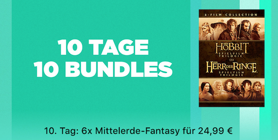 Auch heute läuft wieder Apples Aktion "10 Tage, 10 Bundles", bei der sich an 10 Tagen im Juli jeweils ein ausgewähltes Film-Bundle vergünstigt aus dem iTunes Sore laden lassen wird. Dabei lässt sich heute die "Mittelerde-Collection", bestehend aus den drei "Herr der Ringe" und den drei "Hobbit" Filmen in HD-Qualität vergünstigt erwerben. Würde man sich die Filme einzeln im iTunes Store kaufen, müsste man insgesamt € 59,94 hinblättern. Dank der Aktion bekommt man nun alle sechs im Bundle für zusammen nur € 24,99. Wie immer gilt bei Kauf-Filmen aus dem iTunes Store, dass diese so oft geschaut werden können, wie man mag und dass man sie jederzeit erneut aus dem iTunes Store herunterladen kann. Hier gehts zum heute vergünstigten Bundle: Mittelerde-Collection