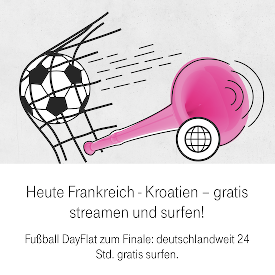 Auch wenn es "Die Mannschaft" bei der Fußball-WM in Russland in diesem Jahr nicht über die Vorrunde hinaus geschafft hat, hat die Telekom wie versprochen zum heute anstehenden Finale der WM zwischen Frankreich und Kroatien die Buchung der kostenlosen DayFlat zum Streaming der Übertragungen freigeschaltet. Hierzu kann man sich auf der extra geschalteten Aktionsseite registrieren und wird anschließend entsprechend per SMS über die Freischaltung informiert. Wichtig dabei: Die Telekom bearbeitet die Anfragen nach dem First-com-First-serve Prinzip. Soll heißen, kommt man eventuell zu spät, kann es sein, dass man keine kostenlose DayFlat mehr erhält.