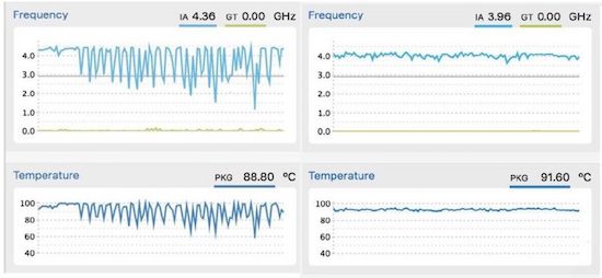 Unter anderem haben die Kollegen von CNET for und nach der Installation des Updates verschiedene Tests im Rahmen einer Videobearbeitung gefahren. Vor dem Patch wurden dabei teils dramatische und flackernde Unterschiedene bei der internen Temperatur und der Prozessor-Taktrate sichtbar, die nach der Installation nicht mehr auftraten.