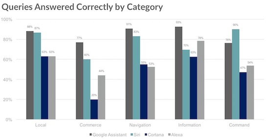 Siri verstand bei dem Test 99% der Anfragen korrekt und konnte davon 78,5% richtig beantworten. Damit konnte sich Apples Assistent deutlich gegenüber April 2017 verbessern,  als er noch auf 66,1% richtige Antworten kam. Siris beste Kategorie bei den Fargen war der Bereich "Command", wo 90% der Anfragen korrekt beantwortet wurden. Dabei lag Siri sogar vor allen anderen Konkurrenten, wenn es um die Steuerung des iPhone, Smart-Home-Produkten, Apple Music, etc. geht. Ebenfalls gut schlägt sich Siri in den Kategorien "Local" (87% korrekte Antworten), "Navigation" (83%) und "Information" (70%).