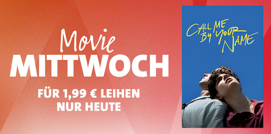 Auch heute hat Apple wieder den sogenannten "Movie Mittwoch" ausgerufen. Dabei wird jeden Mittwoch ein ausgewählter Film aus dem iTunes-Sortiment für 24 Stunden zum Sonderpreis von nur € 1,99 in HD-Qualität zum Leihen angeboten. Heute erhält man dabei das preisgekrönte Drama Call Me By Your Name über die Liebe zwischen zwei Teenagern. Nachdem man den Leih-Film geladen hat, kann er innerhalb von 30 Tagen angeschauen werden. Wie immer bei geliehenen Filmen aus dem iTunes Store gilt: Hat man hiermit einmal begonnen, muss man ihn innerhalb von 48 Stunden beenden.