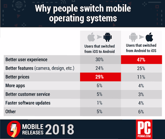 29% der Nutzer, die von iOS zu Android wechselten nannten "bessere Preise" als Grund, während 11% beim Wechsel von Android zu iOS denselben Grund nannten. Weitere 6% der Nutzer, die von iOS zu Android wechselten gaben an, dass sie auf der neuen Plattform mehr Apps vorfinden, während dies nur für 4% der Switcher von Android zu iOS gilt.