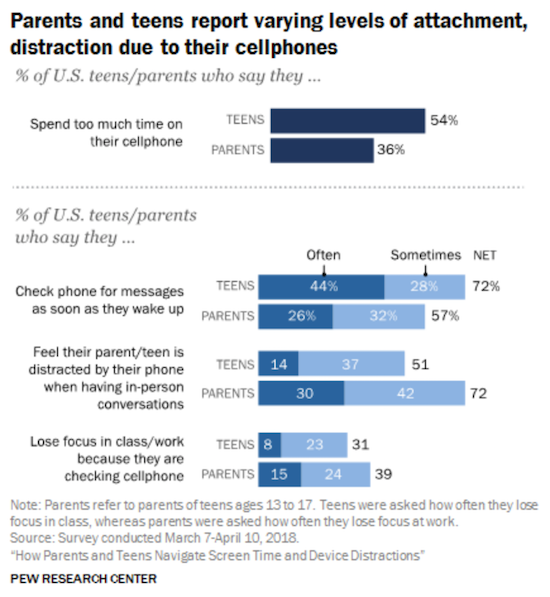 In den USA hat das Pew Research Center eine interessante Umfrage zum Thema Smartphone-Nutzung durchgeführt. Dabei kam heraus, dass 54% der dortigen Teenager und 36% der Eltern der Meinung sind, dass sie zu viel Zeit mit ihrem Smartphone verbringen. Auch Gegenseitig wird dies so wahrgenommen. Beide Parteien haben das Gefühl, dass die Familienmitglieder zu häufig von ihrem Smartphone abgelenkt werden, was sich auch auf die direkte, persönliche Kommunikation im Haus auswirke.