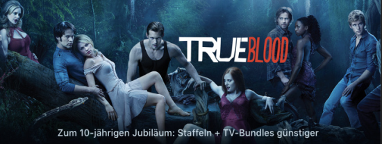 Zusätzlich zu den bereits gestern vermeldeten Vergünstigungen bei den Blockbuster-Serien "The Big Bang Theory", "Young Sheldon" und "Game of Thrones" hat sich heute eine weitere vergünstigte TV-Serie im iTunes Store eingefunden. Anlässlich des 10-jährigen Jubiläums der Horror-/Fantasy-Serie "True Blood" bietet Apple aktuell sämtliche deutsch- und englischsprachige Staffeln der Reihe, sowie verschiedene Bundles deutlich vergünstigt an. Eine gute Gelegenheit also, den Serien-Vorrat für die nahende dunkle Jahreszeit aufzufüllen. Die folgenden Links bringen euch direkt zu den vergünstigten Inhalten im iTunes Store: