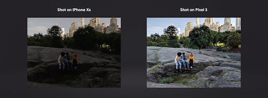 Im Fokus der Präsentation stand das Kamerasystem der neuen Pixel 3 Smartphones, welches unter anderem über einen HDR+ Modus und eine Funktion namens "Top Shot", die mehrere Bilder mit HDR+ aufnimmt und daraus dem Nutzer das vermeintlich beste empfiehlt. Ähnlich wie bei den neuen iPhones kann auch beim neuen Google-Smartphone die Tiefenschärfe von Porträtfotos bearbeitet werden. Für schlechte Lichtverhältnisse bietet das Gerät die sogenannte "Night Sight"-Funktion, welche dort für sehr gute Ergebnisse sorgen soll. Google bewirbt dies mit Vergleichsbildern zwischen seinem Pixel 3 und dem iPhone XS. Als wirkliche Neuerung gegenüber der Konkurrenz verfügt das Pixel 3 über ein zweites Kamera-Objektiv auf der Vorderseite, mit dem sich unter anderem Gruppen-Selfies erstellen lassen. Dies ist umso interessanter, da der Aufnahmebereich um 184% größer ist, als beispielsweise beim iPhone XS.