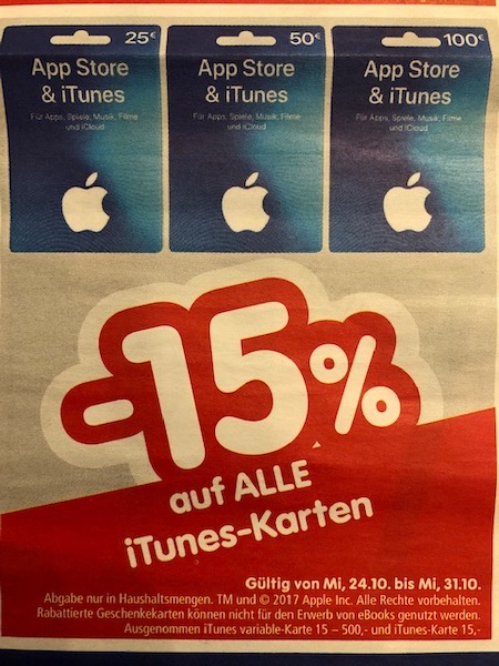 Achtung: Leider kann ich die Hinweise auf die günstigen iTunes-Karten nicht in jedem einzelnen Fall überprüfen. Checkt daher bitte vorher noch einmal ab, ob die jeweilige Filliale den Rabatt auch tatsächlich gewährt!