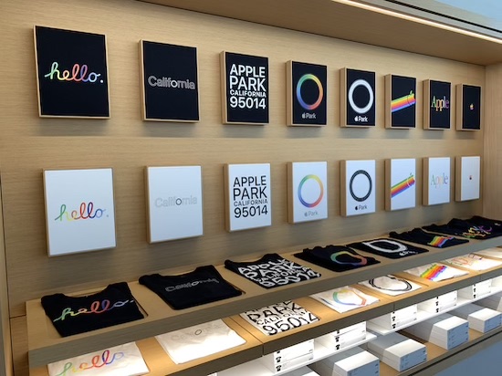 Überraschend ist zunächst einmal, wie viele Parkplätze dort für Besucher vorgesehen sind. Allerdings merkt man auch ziemlich schnell, dass diese auch nötig sind. Während einem der Zutritt zum UFO naturgemäß ohne Mitarbeiterausweis verwehrt bleibt, lockt das Besucherzentrum mit großzügigen Flächen, auf denen ein Café, ein AR-gestütztes Modell des Apple Park und ein Apple Store samt Merchandising-Ecke Platz finden. In letzterer findet man dann auch weltweit exklusiv offizielles Apple-Merchandising von T-Shirts über Einkaufstaschen und Caps bis hin zu Memory-Spielen mit Apple-Produktkarten.
