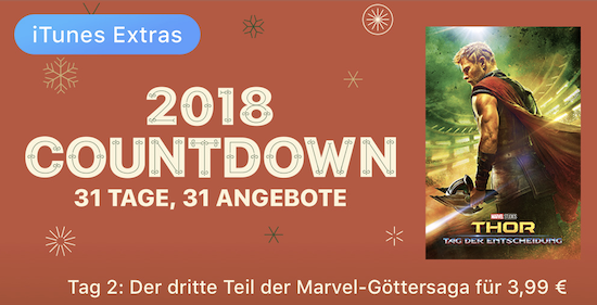 Das Weihnachtsfest rückt mal wieder näher und während sich bei manchen Freude und Besinnlichkeit breit macht, kommt bei anderen eher Hektik beim Weihnachtsshopping in den sich füllenden Fußgängerzonen und Shoppingzentren dieser Welt auf. Vor allem für Kinder bedeutet die Zeit bis zum Weihnachtsfest jeden Tag ein bisschen Freude beim Öffnen der Türen des Adventskalenders. Auch Apple bietet in diesem Jahr wieder eine Dezember-Aktion an und weitet diese gar auf 31 Tage, also bis zum Ende des Monats aus. Unter dem Motto "2018 Countdown - 31 Tage, 31 Angebote" wird man dabei jeden Tag einen neuen Inhalt aus dem Film-Bereich des iTunes Store zum Sonderpreis laden können. Heute erhält man auf diese Weise den Marvel-Kracher Thor: Tag der Entscheidung für nur € 3,99 in HD-Qualität zu Kaufen.