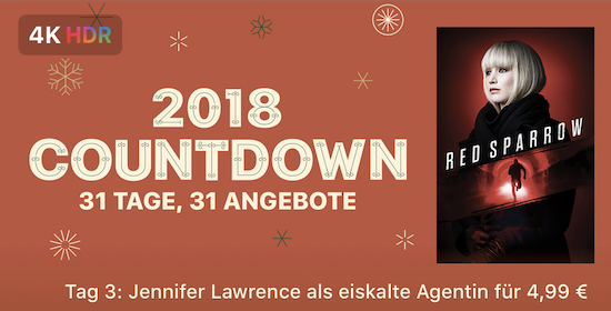 Das Weihnachtsfest rückt mal wieder näher und während sich bei manchen Freude und Besinnlichkeit breit macht, kommt bei anderen eher Hektik beim Weihnachtsshopping in den sich füllenden Fußgängerzonen und Shoppingzentren dieser Welt auf. Vor allem für Kinder bedeutet die Zeit bis zum Weihnachtsfest jeden Tag ein bisschen Freude beim Öffnen der Türen des Adventskalenders. Auch Apple bietet in diesem Jahr wieder eine Dezember-Aktion an und weitet diese gar auf 31 Tage, also bis zum Ende des Monats aus. Unter dem Motto "2018 Countdown - 31 Tage, 31 Angebote" wird man dabei jeden Tag einen neuen Inhalt aus dem Film-Bereich des iTunes Store zum Sonderpreis laden können. Heute erhält man auf diese Weise den Action-Kracher Red Sparrow mit Jennifer Lawrence für nur € 4,99 in 4K HDR-Qualität zu Kaufen.