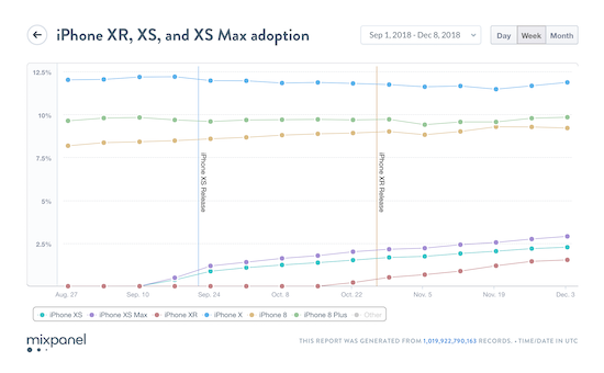 Auch wenn Apple zuletzt verlauten lassen hat, dass das iPhone XR seit seinem Erscheinungstag das beliebteste aller iPhone-Modelle sei, besagen nicht nur die Meldungen der Zulieferer aus Fernost, dass das iPhone in diesem Jahr generell schwächelt. Nun werden diese Meldungen auch durch Zahlen der Marktbeobachter von Mixpanel gestützt. Die Daten stammen aus den Analyse-Plugins für Apps und mobile Webseiten, die das Unternehmen anbietet, aus denen neben der iOS-Version unter anderem auch das verwendete iPhone-Modell hervorgeht.