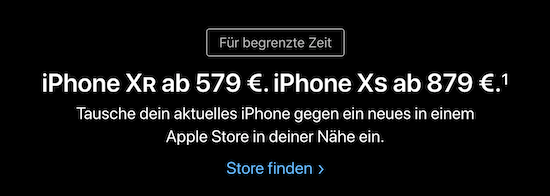 Apple hat in den vergangenen Wochen bereits mit verschiedenen Aktionen versucht, seine schleppenden iPhone-Verkäufe anzukurbeln. Eine Maßnahme war dabei, alte iPhone-Modelle zurückzunehmen und für diese einen Rabatt auf den Kauf der neuesten Modelle anzurechnen. Was bislang nur in ausgewählten Ländern möglich war, hat Apple nun auch in Deutschland eingeführt. Bereits auf der Startseite von Apple im Web wird die Aktion hierzulande beworben. Sie gilt sowohl für das iPhone XS als auch für das iPhone XR. Je nachdem was für ein Gerät man zurückgibt, kann der Preis für ein neues iPhone XR auf bis zu € 579,- sinken, der für ein iPhone XS auf € 879,-. Eine Übersicht über die Rabatte und Preise hat Apple auf einer zugehörigen Webseite veröffentlicht. Allerdings kann man den Rabatt nicht online beanspruchen, sondern muss sich in einen Apple Retail Store in der Nähe begeben.