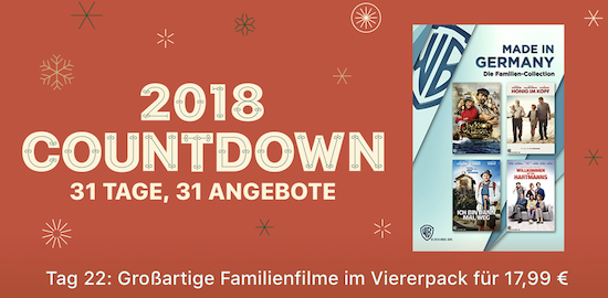 Das Weihnachtsfest rückt mal wieder näher und während sich bei manchen Freude und Besinnlichkeit breit macht, kommt bei anderen eher Hektik beim Weihnachtsshopping in den sich füllenden Fußgängerzonen und Shoppingzentren dieser Welt auf. Vor allem für Kinder bedeutet die Zeit bis zum Weihnachtsfest jeden Tag ein bisschen Freude beim Öffnen der Türen des Adventskalenders. Auch Apple bietet in diesem Jahr wieder eine Dezember-Aktion an und weitet diese gar auf 31 Tage, also bis zum Ende des Monats aus. Unter dem Motto "2018 Countdown - 31 Tage, 31 Angebote" wird man dabei jeden Tag einen neuen Inhalt aus dem Film-Bereich des iTunes Store zum Sonderpreis laden können. Heute erhält man auf diese Weise das Made in Germany Bundle bestehend aus den folgenden vier Filmen für nur € 17,99 in 4K HDR-Qualität zu Kaufen: