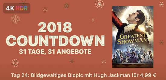 Das Ende des laufenden Jahres rückt mal wieder näher und vor allem für Kinder bedeutet die Zeit rund um das Weihnachtsfest jeden Tag ein bisschen Freude beim Öffnen der Türen des Adventskalenders. Auch Apple bietet in diesem Jahr wieder eine Dezember-Aktion an und weitet diese gar auf 31 Tage, also bis zum Ende des Monats aus. Unter dem Motto "2018 Countdown - 31 Tage, 31 Angebote" wird man dabei jeden Tag einen neuen Inhalt aus dem Film-Bereich des iTunes Store zum Sonderpreis laden können. Heute erhält man auf diese Weise das Biopic Greatest Showman mit Hugh Jackman für nur € 4,99 in 4K HDR-Qualität zu Kaufen.