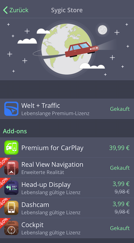 Als diese dann mit iOS 12 eigentlich hätte starten sollen, kam jedoch eine erste Enttäuschung auf, da man bei Sygic nicht die verbreitete App "Sygic GPS" mit CarPlay ausstattete, sondern die weniger bekannte App "Auto Navigation". Dies hat sich nun mit dem jüngsten Update für "Sygic GPS" geändert. Allerdings greift euch Sygic für die Funktion noch einmal kräftig in die Tasche und verlangt € 39,99 per In-App Purchase für die CarPlay-Integration.