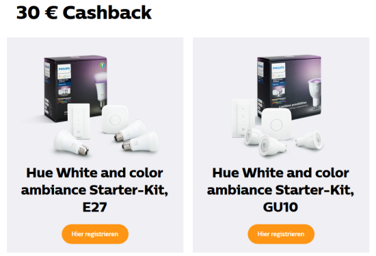 Auch zu Beginn dieses Jahres bietet Philips wieder eine Cashback-Aktion für seine beliebten smarten Lampen der Hue-Reihe an. Dabei hat man die Möglichkeit, beim Kauf eines Starter-Sets mit Dimmschalter bis zu € 30,- zusätzlich zu sparen. Dies gilt beispielsweise für den Kauf eines Starter Kits Hue White and Color Ambiance mit E27- und GU10-Lampen. Beim Starter Kit Hue White Ambiance E27 liegt der Cashback-Betrag bei € 15,-. Wo die Lampen gekauft wurden, ist dabei unabhängig. Aufgrund diverser Rabattaktionen und für gewöhnlich günstigen Preisen, bietet sich beispielsweise der Hue-Shop bei Amazon an. Selbstverständlich gilt das Cashback auch unabhängig von sonstigen Rabattaktionen.