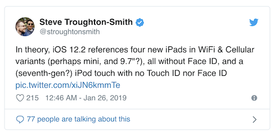 Ebenfalls entdeckt wurde eine Referenz auf einen "iPod 9,1", den es bislang ebenfalls noch nicht gab. Die aktuelle sechste Generation des iPod touch hört auf die interne Bezeichnung "iPod 7,1", was auf ein größeres Update hindeuten könnte. Allerdings soll auch die gesichtete neue Version weder über Face ID oder Touch ID verfügen.