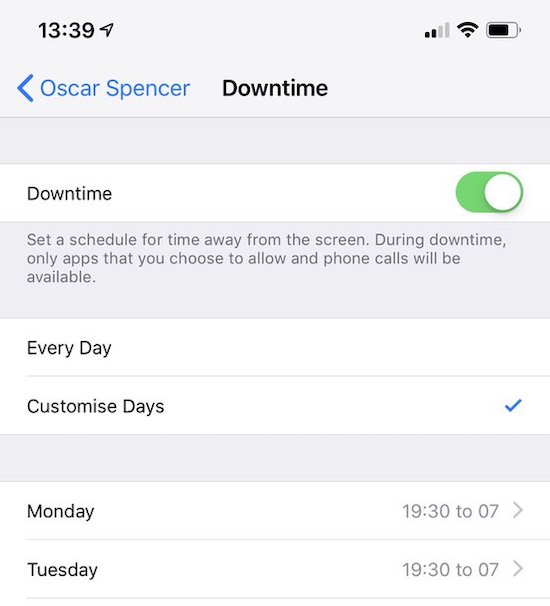 So bieten die zugehörigen Einstellungen künftig die Möglichkeit, die Zeiten für die sogennante "Downtime" taggenau zu steuern (via Sam Spencer). Bislang konnte man lediglich Zeiten definieren, die dann für jedemn Wochentag gleich galten. Mit iOS 12.2 können diese Zeiten für jeden Tag individuell festgelegt werden. So können beispielsweise für das Wochenende andere Zeiten festgelegt werden, als für Werktage.