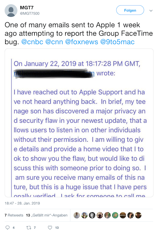 Wie sich inzwischen herausstellte, hat der Entdecker des Bugs bereits vor über einer Woche versucht, Apple hierüber zu informieren. Wohlgemerkt versucht. Dass dies fehlgeschlagen ist sieht man alleine an dem Umgang Apples mit dem Thema inkl. der inzwischen erfolgten hektischen Abschaltung von FaceTime Gruppenanrufen aufgrund des Bugs.