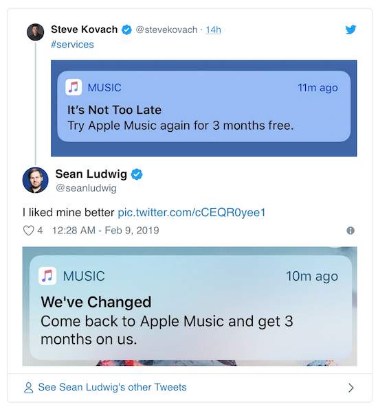 Last but not least bricht Apple einmal mehr mit einer AppStore-Regel für Drittentwickler, Push Notifications nicht für Werbung nutzen zu dürfen. Apple selbst hingegen nutzt die Benachrichtigungen aktuell einmal mehr, um ehemalige Nutzer der drei kostenlose Apple Music Probemonate zu einer Rückkehr zum Streamingdienst aufzufordern einzuladen. Entsprechende Screenshots werden aktuell auf Twitter diskutiert. Unter anderem stellt Apple die Meldungen unter die Überschriften "We’ve changed" oder "It’s not too late", gefolgt von dem Hinweis, dass man Apple Music erneut für drei Monate kostenlos testen könne. Aus Deutschland sind mir derlei Benachrichtigungen derzeit allerdings noch nicht bekannt.
