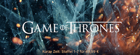 Waren es in den vergangenen beiden Wochen jeweils durchaus interessante Film-Bundles, die Apple deutlich vergünstigt in seinem iTunes Store anbot, kommen aktuell Serienfans auf ihre Kosten, konkret die der Hit-Serie "Game of Thrones". Für viele Beobachter ist sie die beste aller Zeiten, ich persönlich habe es bislang noch nicht einmal geschafft, mir auch nur eine Folge anzusehen. Dies könnte sich demnächst aber ändern, denn der iTunes Store wartet aktuell mit einer ordentlichen Rabattaktion auf. Dabei lassen sich die Staffeln 1 bis 7 der Hit-Serie aktuell für zusammen nur € 49,99 aus dem iTunes Store laden. Eine gute Gelegenheit also zuzuschlagen, nicht nur für all diejenigen, die bislang noch nicht dazu gekommen sind, die Serie anzufangen. Der folgende Link führt direkt zu dem Angebot im iTunes Store: Game of Thrones