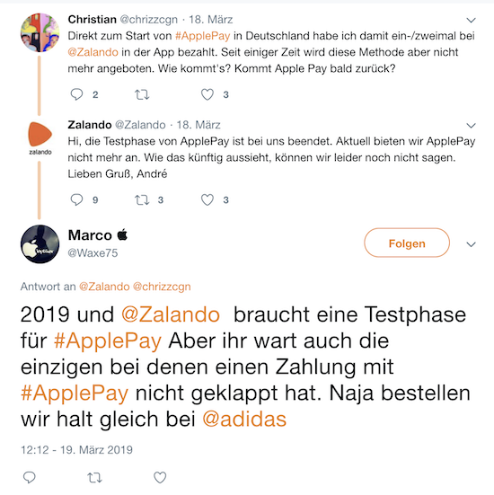 Entsprechend verärgert reagierten deshalb wohl auch bereits verschiedene Kunden auf die Zalando-Entscheidung und machten ihrem Ärger auf Twitter Luft. Immerhin muss die Entscheidung von Apple Pay nicht endgültig sein. Man arbeite derzeit mit Apple an einer Lösung und strebt an, den Bezahldienst in Zukunft auch wieder anbieten zu können.