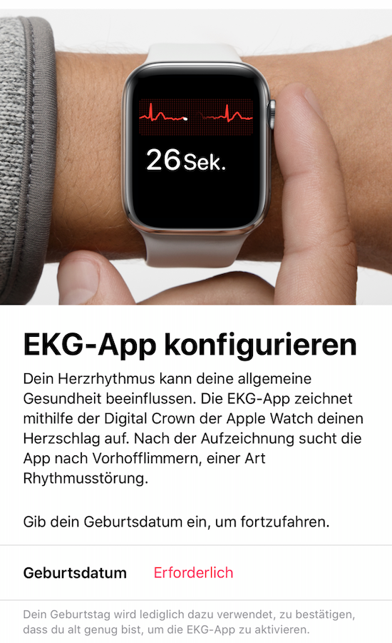 Weiter auf sich warten lässt indes die finale Version von watchOS 5.2, welche eigentlich unter anderem für die Kompatibilität mit der zweiten Generation der AirPods benötigt wird. Auch die EKG-Funktion der Apple Watch Series 4 könnte hiermit ihren Weg auf die deutschen Geräte finden. So lässt sich inzwischen auch hierzulande bereits in der Health-App auf dem iPhone der komplette EKG-Einrichtungsprozess durchlaufen. Einzig die benötigte App auf der Watch fehlt noch (mit Dank an Sven!).
