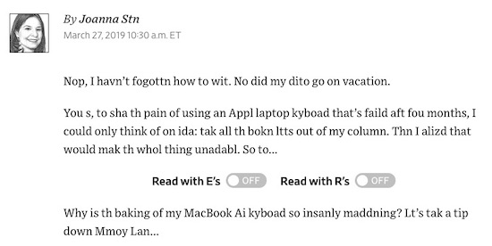 Nun hat sich das Wall Street Journal dieses Themas noch einmal angenommen und dabei festgestellt, dass es nach wie vor Nutzer gibt, die mit den alten Problemen zu kämpfen haben. Die zuständige Redakteurin Joanna Stern illustrierte das Problem dadurch, dass sie ihren Text komplett ohne die Buchstaben E und R verfasste. Mit einem Augenzwinkern hat sie aber immerhin verschiedene Schalter eingebaut, mit denen sich die fehlenden Buchstaben einschalten oder doppelt darstellen lassen, um weiter auf die bekannten Probleme hinzuweisen. Stern schließt ihren Artikel mit einem Fazit, welches vielen Nutzern aus der Seele sprechen dürfte und fordert Apple auf damit aufzuhören, den Schlankheitswahn seiner Geräte über die Usability zu stellen.