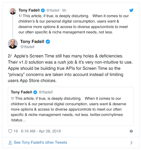 Phil Schiller betont in seiner oben zu lesenden Antwort allerdings auch, dass Apple mit den betroffenen Entwicklern inzwischen daran arbeite, künftig entsprechende Möglickeiten anzubieten, dass auch sie auf legale Art und Weise die benötigten Daten für die Auswertung erhalten können. Die einzige Möglichkeit hierzu wäre wohl die Einführung von entsprechenden APIs, auf die die Entwickler zugrifen können. Genau dies fordert übrigens auch der ehemalige hochrangige Apple-Manager Tony Fadell (auch gerne als "Vater des iPod" bezeichnet) in mehreren Tweets. Ob Apple dieser Forderung bereits mit iOS 13 nachkommen wird, erfahren wir wohl spätestens Anfang Juni auf der diesjährigen WWDC.
