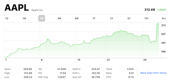 Nun hat sich das Blatt jedoch (ein wenig überraschend) bereits wieder gewendet. Nach der Bekanntgabe der Zahlen für das erste Quartal 2019 legte die Apple-Aktie deutlich zu, so dass Apple erneut über eine Biliarde US-Dollar an Marktkapitalisierung erreichte. Auch wenn der Rekordwert der Aktie von knapp 230,- Dollar pro Wertpapier noch ein Stück weit entfernt ist, reichte ein zwischenzeitlicher Aktienpreis von 212,68 Dollar hierfür aus.