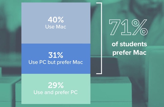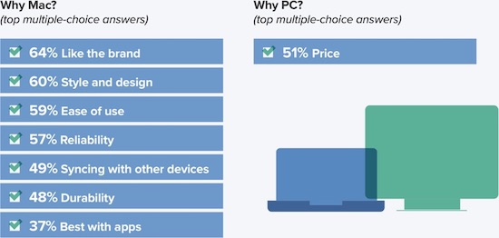 Die Bevorzugung des Mac beruht auf verschiedenen Gründen. So nannten 59% der Umfrageteilnehmer die Nutzerfreundlichkeit, 57% die Langlebigkeit der Produkte, 64% einen Faible für die Marke Apple, 60% den Style und das Design des Macs und 49% die Synchronisierung von Daten im Apple-Ökosystem. Der dominante Grund für die Nutzung eines PCs ist hingegen beinahe ausschließlich der Preis. Von den Studierenden, die den Mac bevorzugen, gaben 43% der aktuellen PC-Nutzer an, dass der Mac trotz des höheren Preises einen größeren Wert zurückgeben würde. Bei den aktuellen Mac-Nutzern liegt dieser Wert bei 80%.