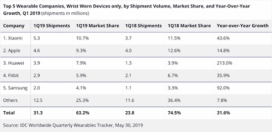 Während das iPhone zuletzt ein wenig schwächelte, taten soch vor allem die Service-Sparte und der Bereich der Wearables und Gadgets, zu denen unter anderem auch die Apple Watch zählt positiv hervor. Die Analysten von IDC haben nun aktuelle Zahlen veröffentlicht, die dies noch einmal verdeutlichen. Demnach hat Apple im ersten Quartal 2019 12,8 Millionen Wearables weltweit an den Mann gebracht. Neben der Apple Watch werden hierzu auch die AirPods und ausgewählte Beats-Kopfhörer gezählt. Damit kommt Apple auf einen Marktanteil von 25,8%, also etwas mehr als ein Viertel. Damit ist man das Wearables-Unternehmen Nummer eins auf der Welt. Und das Wachstum sieht auch weiterhin bestens für Cupertino aus. Im Jahresvergleich konnte Apple hier um knapp 50% zulegen. Apples chinesische Konkurrenten Xiaomi und Huawei folgen bereits mit einem Respektsabstand von 6,6 bzw. 5 Millionen verkauften Geräten auf den Plätzen zwei und drei.