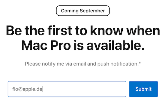Möglicherweise handelt es sich hierbei aber auch um einen Fehler. Klickt man nämlich auf denselben "Notify me"-Link auf der Produktwebseite zum Mac Pro, erscheint in derselben Box noch die altbekannte Meldung "Coming This Fall". Was nun wirklich korrekt ist, muss freilich abgewartet werden. Apple hat in der Vergangenheit auch mehrfach schon separate iOS- und Mac-Events im Herbst abgehalten, wobei letzteres meist im Oktober stattfand. Dies wäre dann auch eine Möglichkeit, die offizielle Verfügbarkeit des Mac Pro anzukündigen. Warten wir es also ab.