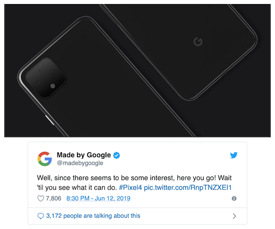 So hat Google heute in einem Tweet bestätigt, dass auch das kommende Pixel 4 Smartphone auf der Rückseite über einen quadratischen Kamerabump verfügen wird. Den Informationen der Kollegen von The Verge zufolge sollen darin zwei Objektive, ein Mikrofon, ein LED-Blitz und ein Spektralsensor untergebracht sein. Beim Nachfolger von iPhone XS und iPhone XS Max erwartet die Gerüchteküche aktuell eine Triple-Lens Kamera, beim Nachfolger des iPhone XR im selben Design eine Dual-Lens Kamera.