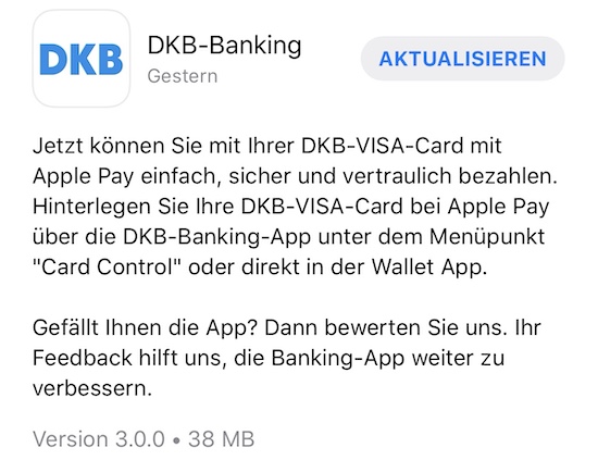 Lange mussten die Kunden der DKB warten, nun ist es endlich soweit. Ab sofort können auch Sie mit Apples mobilem Bezahldienst Apple Pay kontaktlos bezahlen (mit Dank an alle Tippgeber!). Die Neuerung kommt mit dem gestern veröffentlichten Update der DKB-App auf Version 3.0. Die Bank hat damit ihre Ankündigung gehalten, Apple Pay im "Frühsommer" einführen zu wollen. In der Wallet-App unter iOS findet man nach der Installation des Updates nun auch die Möglichkeit, eine VISA-Kreditkarte der DKB hinzuzufügen. Zudem informiert Apple sogar teilweise per Push Notification der Wallet-App über die neue Option.