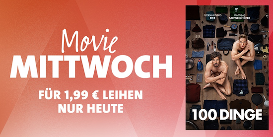 Auch heute hat Apple wieder den sogenannten "Movie Mittwoch" ausgerufen. Dabei wird jeden Mittwoch ein ausgewählter Film aus dem iTunes-Sortiment für 24 Stunden zum Sonderpreis von nur € 1,99 in HD-Qualität zum Leihen angeboten. Heute erhält man dabei die deutsche Schweighöfer-Komödie 100 Dinge. Nachdem man den Leih-Film geladen hat, kann er innerhalb von 30 Tagen angeschauen werden. Wie immer bei geliehenen Filmen aus dem iTunes Store gilt: Hat man hiermit einmal begonnen, muss man ihn innerhalb von 48 Stunden beenden.