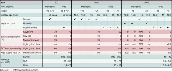 Nach dem neuen 16"-Gerät sollen dann ab dem kommenden Jahr sukzessive auch die weiteren, aktuell noch mit der Butterfly-Tastatur ausgestatteten MacBook-Modelle auf die neue Tastatur umgestellt werden. Diese soll dank ihrer neuen Mechanik dann weniger anfällig gegenüber eindringende Schmutzpartikel, Hitze oder andere Fehlfunktionen sein, von denen die Butterfly-Tastaturen, wohl aufgrund ihrer superschlanken Bauform geplagt werden. Seinen erwarteten Zeitplan hat Kuo in der nachfolgenden Tabelle dokumentiert.