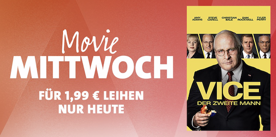 Auch heute hat Apple wieder den sogenannten "Movie Mittwoch" ausgerufen. Dabei wird jeden Mittwoch ein ausgewählter Film aus dem iTunes-Sortiment für 24 Stunden zum Sonderpreis von nur € 1,99 in HD-Qualität zum Leihen angeboten. Heute erhält man dabei die Polit-Komödie Vice - Der zweite Mann mit Christian Bale und Steve Carell. Nachdem man den Leih-Film geladen hat, kann er innerhalb von 30 Tagen angeschauen werden. Wie immer bei geliehenen Filmen aus dem iTunes Store gilt: Hat man hiermit einmal begonnen, muss man ihn innerhalb von 48 Stunden beenden.