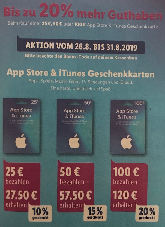 Die neue Woche beginnt mit guten Nachrichten für alle Schnäppchenjäger: Es gibt wieder vergünstigte iTunes-Geschenkkarten. So sind es ab heute die Filialen der Supermarktkette Lidl, die die Karten mit einem Zusatz-Guthaben in Höhe von bis zu 20% auf den regulären Kartenwert anbieten. Dies gilt gestaffelt für alle Karten im Wert von € 25,- (10% Zusatzguthaben), € 50,- (15% Zusatzguthaben) und €100,- (20% Zusatzguthaben). Aber Achtung: Die Aktion gilt nur bis Samstag, den 31. August 2019, bzw. solange der Vorrat reicht. Die Anzahl der Karten pro Kauf ist anscheinend nicht begrenzt. Man sollte also im Zweifel schnell sein, um noch rechtzeitig zuschlagen zu können. Schließlich haben die Karten ja kein Verfallsdatum. Der aufgedruckte Wert der Karten und das Zusatz-Guthaben können sowohl für Musik, als auch für Fernsehserien, Filme und Einkäufe im Mac- und iOS-AppStore genutzt werden. (mit Dank an Steffen!)