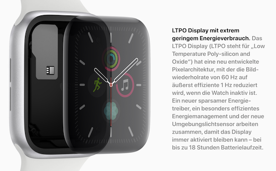 Der Einsatz von LTPO bringt eine Energieeinsparung von ca. 15% und hat unter anderem dazu geführt, dass die Apple Watch Series 5 auf dieselbe Akkulaufzeit kommt wie auch die Series 4 - und das trotz des neuen "Always-On" Displays. Apple schreibt dazu auf seiner Webseite: