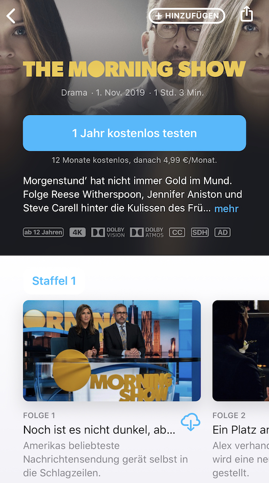 Nun ist der 01. November 2019 also gekommen und damit auch der Start von Apple TV+. Inzwischen ist der Dienst auch tatsächlich live und kann über die TV-App gebucht werden. Dabei erhält man zunächst ein siebentägiges kostenloses Probe-Abonnement, während dem man die Inhalte testen kann. Kündigt man das Probe-Abonnement vor dessen Ablauf nicht, wird es anschließend in ein kostenpflichtiges Abonnement für monatlich € 4,99 umgewandelt, welches ebenfalls monatlich gekündigt werden kann. Kundenm, die nach dem 10. September ein iPhone, iPad, iPod touch, Apple TV oder Mac erworben haben, bekommen ein ganzes Jahr kostenlosen Zugriff auf Apple TV+. Hierfür muss man nichts weiter tun, die Berechtigung hierzu wird automatisch geprüft. Apple hat zum Anmeldeprozess ein eigenes Support-Dokument veröffentlicht.