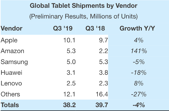 Ähnlich wie das iPhone Anfang dieses Jahres, hat auch das iPad bereits die eine oder andere schwierige Phase hinter sich. Und ähnlich wie jetzt mit dem iPhone 11 gelang es Apple auch beim iPad mit einer cleveren Produktstrategie das Ruder herumzureißen. Dies belegen nun einmal mehr die aktuellen Zahlen der Analysten von Strategy Analytics in ihrem Bericht zu den weltweiten Tablet-Marktanteilen im dritten Quartal 2019. Demzufolge konnte Apple beim Marktanteil um ordentliche 4% oder 10,1 Millionen Geräte im Vergleich zum Vorjahresquartal zulegen, während der gesamte Tabletmarkt um den selben Wert nachgab. Lediglich Apple, Amazon und Lenovo wiesen eine positive Entwicklung auf.