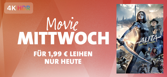 Auch heute hat Apple wieder den sogenannten "Movie Mittwoch" ausgerufen. Dabei wird jeden Mittwoch ein ausgewählter Film aus dem iTunes-Sortiment für 24 Stunden zum Sonderpreis von nur € 1,99 in 4K HDR-Qualität zum Leihen angeboten. Heute erhält man dabei den Fantasy-Action Kracher Alita: Battle Angel mit Chrisoph Waltz und Jennifer Connelly. Nachdem man den Leih-Film geladen hat, kann er innerhalb von 30 Tagen angeschauen werden. Wie immer bei geliehenen Filmen aus dem iTunes Store gilt: Hat man hiermit einmal begonnen, muss man ihn innerhalb von 48 Stunden beenden.