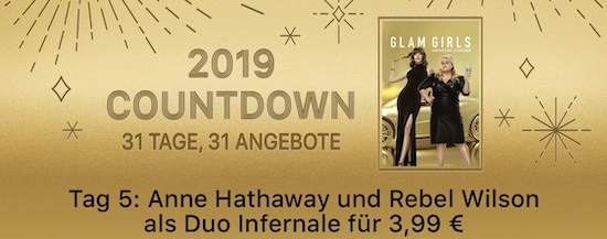 Das Weihnachtsfest rückt mal wieder näher und während sich bei manchen Freude und Besinnlichkeit breit macht, kommt bei anderen eher Hektik beim Weihnachtsshopping auf. Vor allem für Kinder bedeutet die Zeit bis zum Weihnachtsfest jeden Tag ein bisschen Freude beim Öffnen der Türen des Adventskalenders. Auch Apple bietet in diesem Jahr wieder eine Dezember-Aktion an und weitet diese gar auf 31 Tage, also bis zum Ende des Monats aus. Unter dem Motto "2019 Countdown - 31 Tage, 31 Angebote" wird man dabei jeden Tag mit einem neuen Inhalt aus dem Film-Bereich des iTunes Store zum Sonderpreis beschenkt. Heute erhält man auf diese Weise die Komödie Glam Girls mit Anne Hathaway für nur € 3,99 in 4K HDR Qualität zu kaufen.