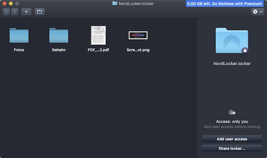 Ein Unterschied besteht allerdings darin, dass man sich vor der Nutzung mit einem Nutzerkonto anmelden muss. Verfügt man bereits über ein NordVPN-Konto, kann dieses verwendet werden. Daran erkennt man schon, dass die Vollversion von NordLocker kostenpflichtig ist (wenn auch derzeit zu einem eher symbolischen Preis). Die Grundfunktionen lassen sich allerdings auch kostenlos nutzen. Dabei ist die maximale Größe des Tresors allerdings auf 5 GB beschränkt.