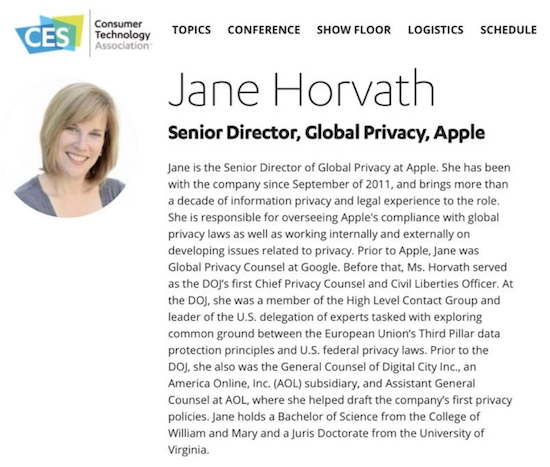 Jahr für Jahr nutzen verschiedene von Apples Konkurrenten auf dem Smartphonemarkt die jeweils im Januar in Las Vegas stattfindende Consumer Electronics Show (CES), während Apple selbst auf der Veranstaltung bereits seit Jahren durch Abwesenheit glänzt. Dies wird sich im kommenden Jahr ändern. Allerdings wird Apple die Show nicht nutzen, um neue Produkte vorzustellen. Stattdessen entsendet man die zuständige Managerin für Datenschutz, Jane Horvath (Senior Director of Privacy) nach Las Vegas, wo sie im Rahmen eines "Chief Privacy Officer Roundtable" gemeinsam mit den Privacy-Managern von Facebook, Procter & Gamble und the FTC unter dem Titel "What consumers want" über das Thema Datenschutz diskutieren wird, wie Bloomberg berichtet.
